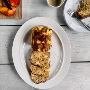Ben jij al bekend met het recept voor de bananenbrood met cheesecake vulling? Deze variant met perzik mag je dan echt niet missen! Door de cheesecake swirl is dit baksel luchtiger dan zijn voorganger en de perzik maakt dit geheel lekker zoet.