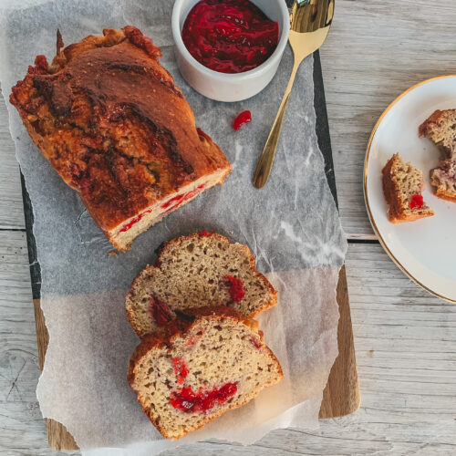Wel eens een plak bananenbrood met jam door het bananenbrood geproefd in plaats van als beleg? Door de jam (naja… eigenlijk vruchtenspread met minder suiker) door het beslag heen te drizzelen krijgt je hele baksel een fruitige smaak. In dit recept heb ik frambozen spread gebruikt, maar je kan uiteraard gebruiken wat jij lekker vindt!
